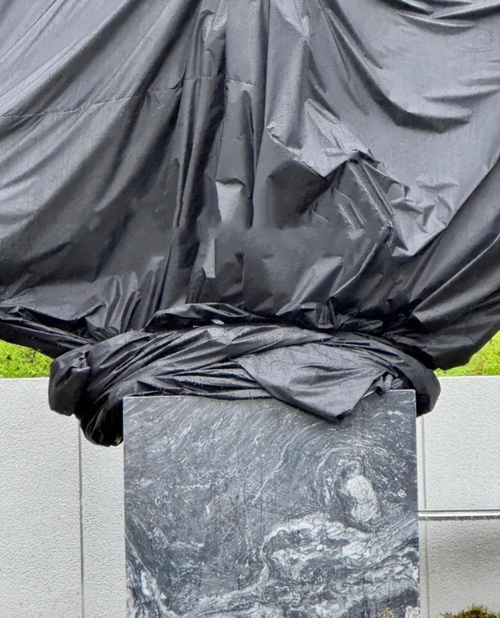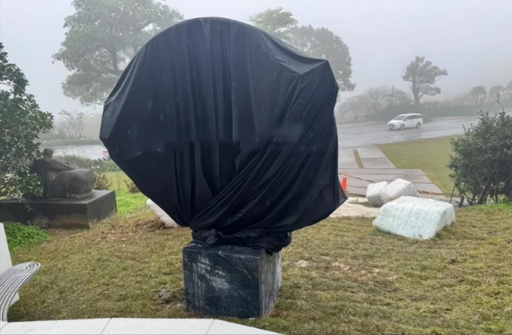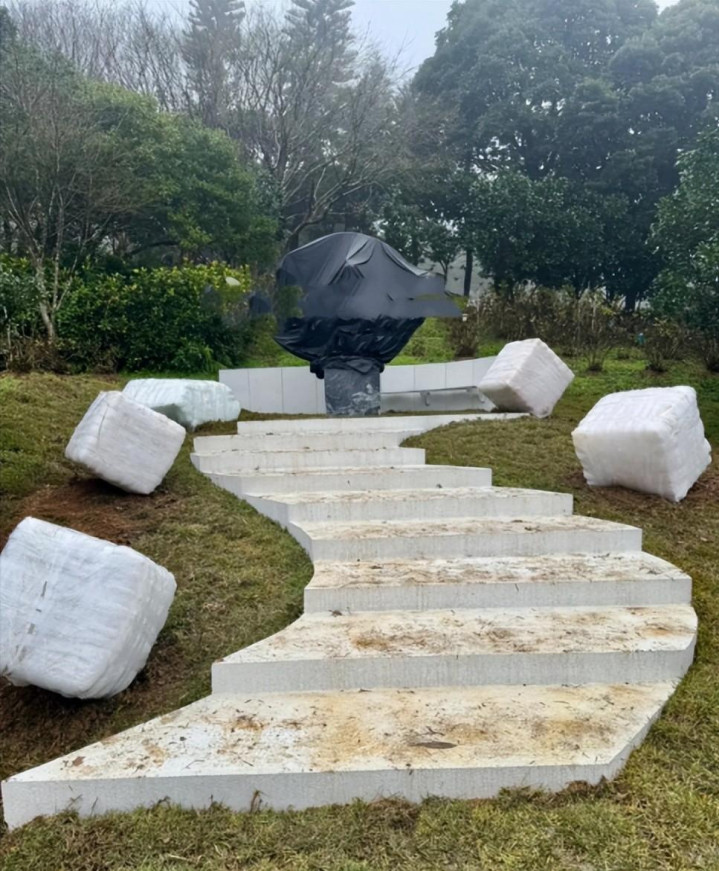 而重头戏当然是大S的主雕像了,底座是用了正方形花灰色大理石,而雕像则包裹了一块巨大的黑色布块遮挡,想必也是艺术感满满吧!