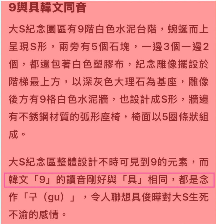 首先比较出挑的便是用9块白色水泥拼凑起来的台阶,它呈现出了S形,顾名思义代表“大S”,而台阶数落“9”,在韩语里的谐音为 “具”。两者结合,寓意具俊晔会永远陪伴着大S,这深藏爱意足实令人感动。